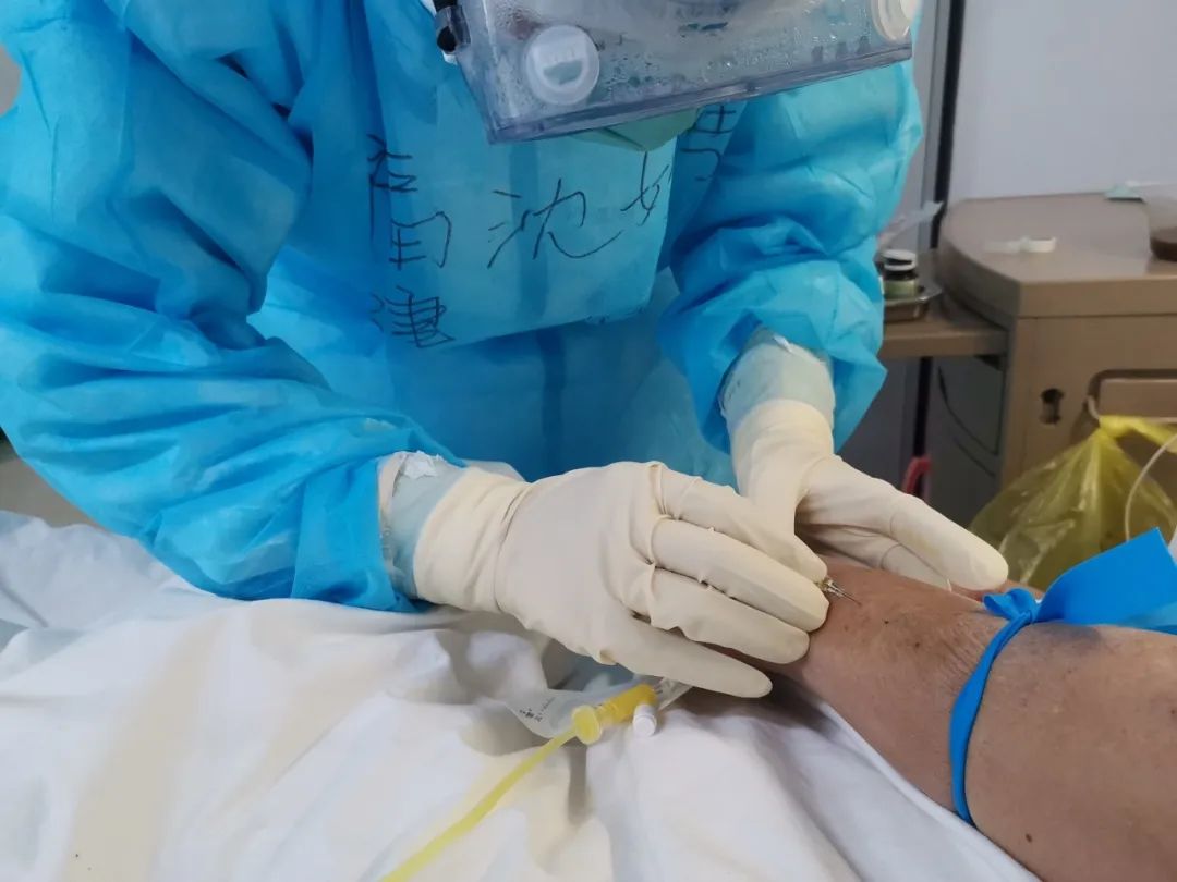 留置針穿刺這是對(duì)我們最大的考驗(yàn)。大多老年人血管不好找,戴著三層的外科手套,血管完全摸不到,護(hù)目鏡有時(shí)候處理不好也會(huì)起霧,看不清,即使這樣我們也克服了種種困難,為每一位患者提供最優(yōu)質(zhì)的護(hù)理。
