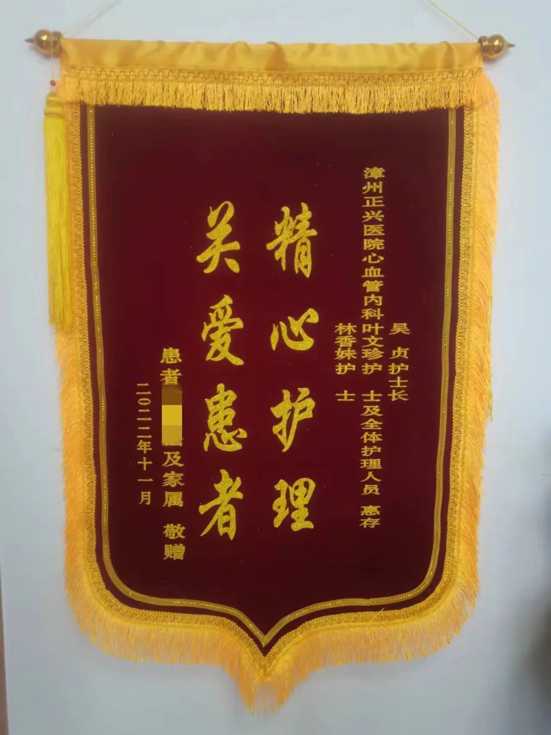 江爺爺及其家屬為了感謝我院心血管內科醫(yī)護人員對他的付出,在11月23日這天特意送來了兩面錦旗。