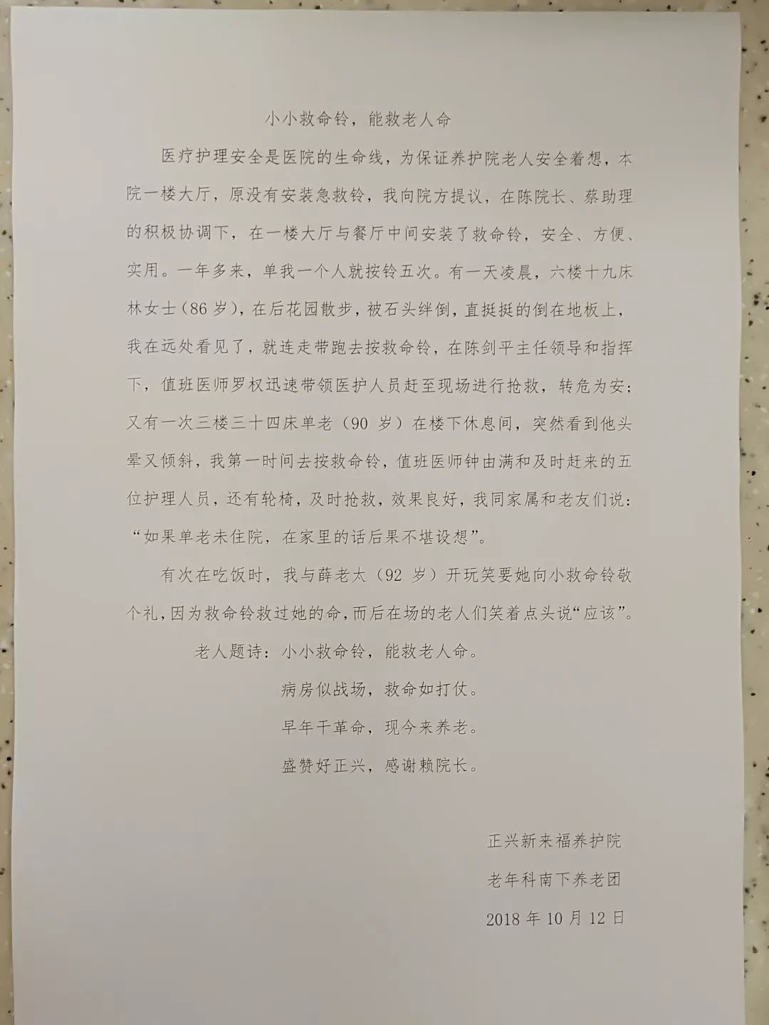 近日,正興新來福養(yǎng)護(hù)院的老人寫了一封很有意義的信: