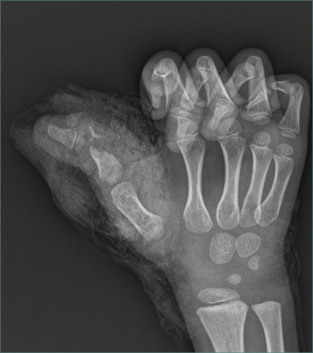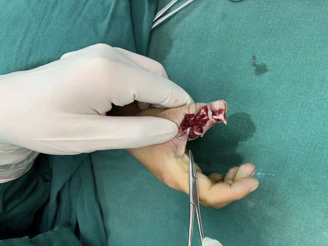 昊昊被緊急送到醫(yī)院后,立即完善相關檢查,檢查可見昊昊右手大拇指骨頭粉碎嚴重,大拇指關節(jié)處離斷僅橈側部分皮膚相連,肌腱斷裂外露,雙側血管神經(jīng)斷裂,刻不容緩,需要馬上進行手術!