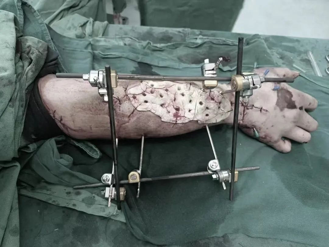 針對(duì)術(shù)中出現(xiàn)的治療難點(diǎn),鐘醫(yī)師對(duì)應(yīng)采用血管移植+肌腱轉(zhuǎn)位功能重建術(shù),切取患者右前臂近2cm的自體血管進(jìn)行血管移植術(shù),在手術(shù)顯微鏡下,直徑不足半毫米的血管被蛛絲般纖細(xì)的縫線橋接重建,對(duì)于肌腱轉(zhuǎn)位前臂切開(kāi)減壓帶來(lái)的皮膚缺損用骨水泥暫時(shí)覆蓋保護(hù)創(chuàng)面。