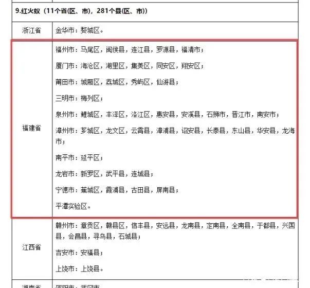 截至2021年3月,據(jù)農(nóng)業(yè)農(nóng)村部門監(jiān)測,紅火蟻已傳播至12個?。▍^(qū)、市)435個縣(市、區(qū)),尤其是近5年來新增紅火蟻發(fā)生縣級行政區(qū)191個,在城市公園綠地、農(nóng)田、林地及其他公共地帶都有發(fā)生。漳州地區(qū),漳浦縣、薌城區(qū)、龍海區(qū)、龍文區(qū)、長泰區(qū)、云霄縣、東山縣、華安縣均在紅火蟻的分布范圍內(nèi)。